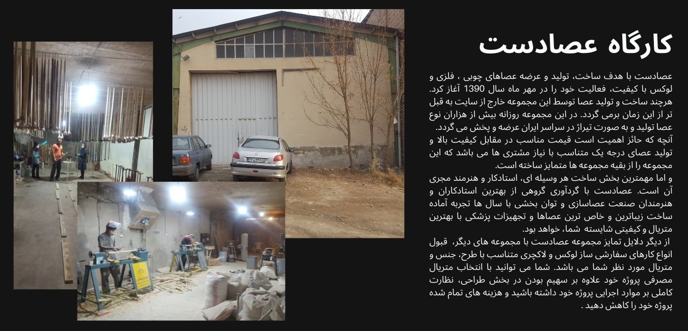 فعالیت گروه عصادست از سال 1390 در کارگاهی به مساحت 400 متر مربع واقع در جاجرود تهران با هدف خدمت به جامعه عزیز سالمند و پاسخ به نیازهای طبی آغاز گردید . برای این منظور تلاش های بسیاری گردید که از استانداردهای روز جهان و آموزه های پزشکی بهره های لازم را برده و در ساخت و تولید با کیفیت ترین محصولات به کار گرفته شود. پس از کسب تجارب ارزشمند و استقبال افتخار آمیز مخاطبین عزیز و به منظور آشنایی همه هموطنان در اقصی نقاط میهن ، فروشگاه اینترنتی عصادست از سال 1396 راه اندازی گردید. یکی از اتفاقات مهم این دوره پاسخ به درخواست عزیزان خوش ذوقی بود که عصا را نه برای مصارف طبی و سالمندی بلکه برای تکمیل پرستیژ و شیک پوشی خود میخواهند.