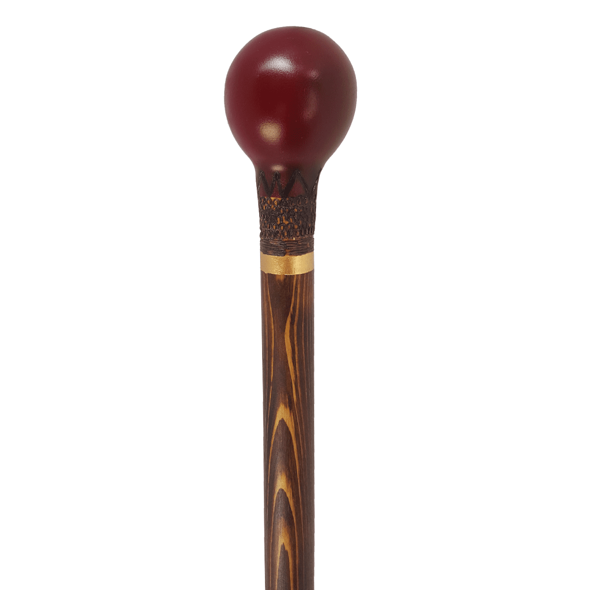 - عصای شاه سوری کد 486 یکی از زیباترین عصاهای تولید شده توسط عصادست میباشد. این عصا با دسته شاهی از جنس چوب گردو میباشد که تمام آن با رنگ زرشکی رنگ رزی شده است. در زیر دسته این عصا یک لایه قلمه زنی را مشاهده میکنیم و در قسمت پایین تر چوب عصا با رنگ گردویی و رگه های زیبای چوب روسی میباشد که خودنمایی میکنند. در قسمت پایین تر در وسط عصا قسمتی به رنگ زرشکی به صورت ست با دسته عصا درامده وتا پایه عصا میرود. در قسمت انتهایی عصا دوباره شاهد رنگ گردویی چوب عصا میباشیم.