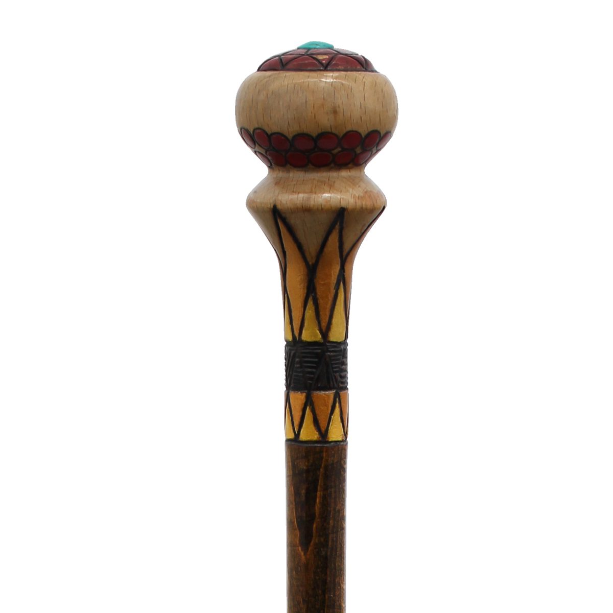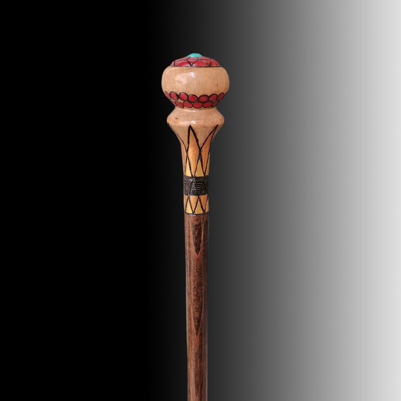 این عصا به دلیل نقش و طرح خاص و بی نظیر آن، قلمه زنی، استفاده از رنگ ها، کار شدن سنگ فیروزه نیشابور اصل روی آن، شیار ها و خطوط هندسی ظریف و … چشم هر بیننده ای را به خود جذب می کند.